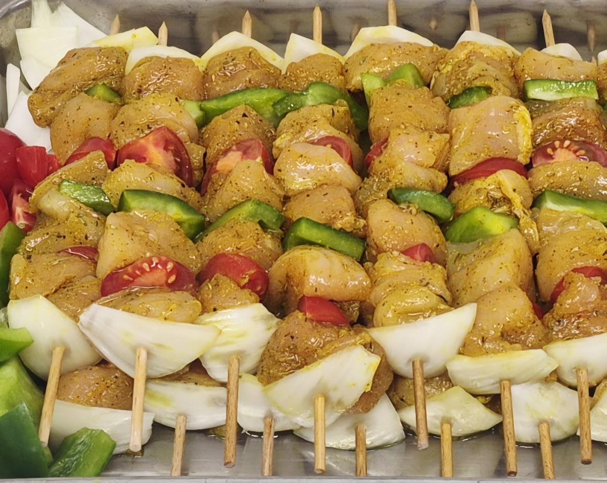 Brochette de Viande de volaille marinée et légumes, idéal pour les barbecues.