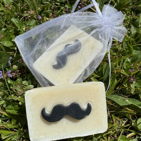 Savon moustache : 1 savon coco olive emballé dans un sac organza