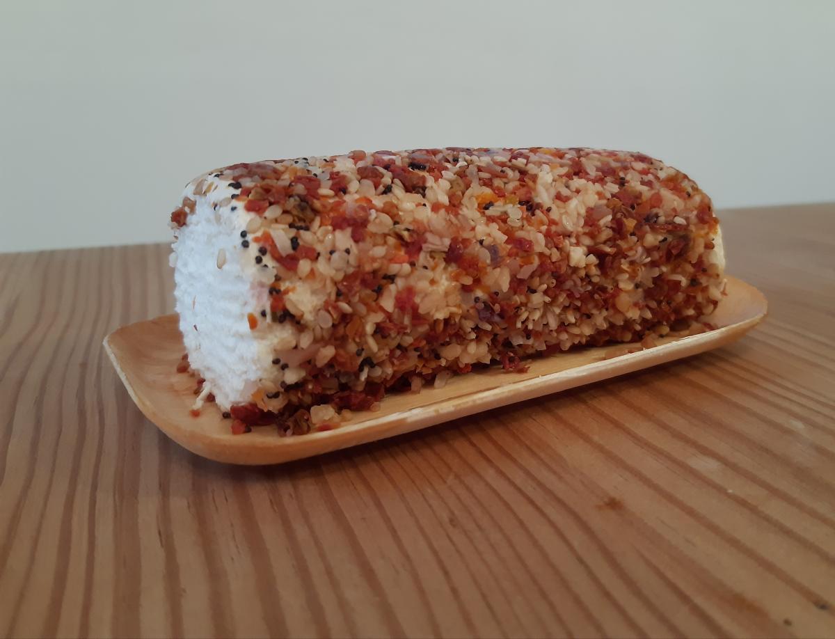 Ingrédients : lait cru entier de vache, ferments lactiques, sel, présure, enrobage : échalotes, graines de pavot, tomate.