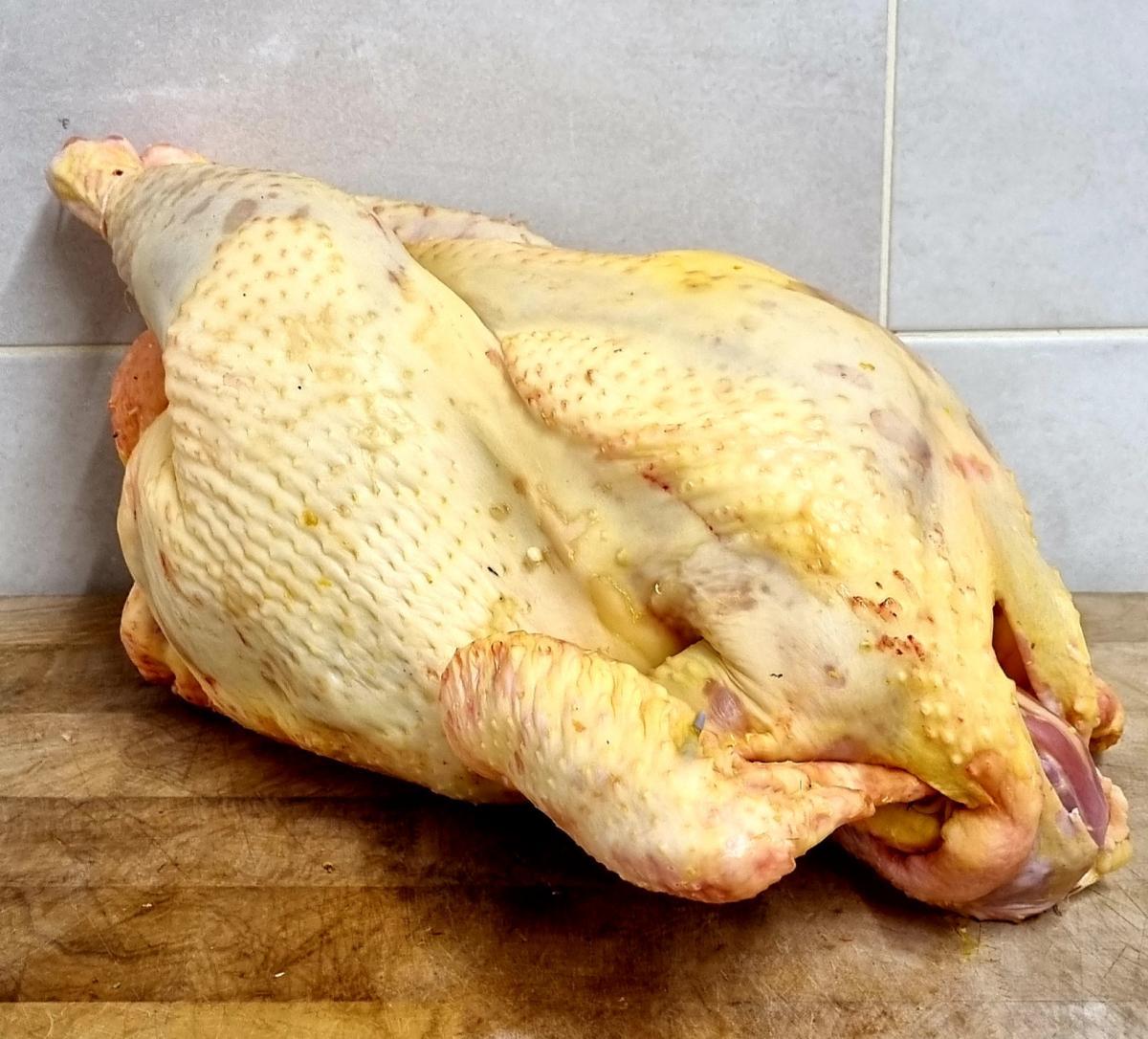 Chapon élevé à la ferme et terminé au maïs et au lait.
