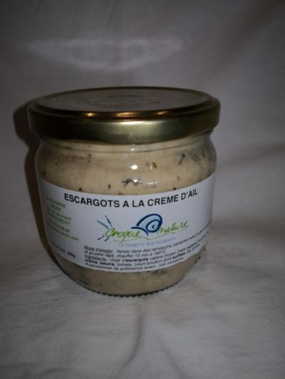 Ingrédients: chair d'escargots calibre moyen ( Hélix Aspersa), crème, ail, tomate, court-bouillon, sel, poivre.