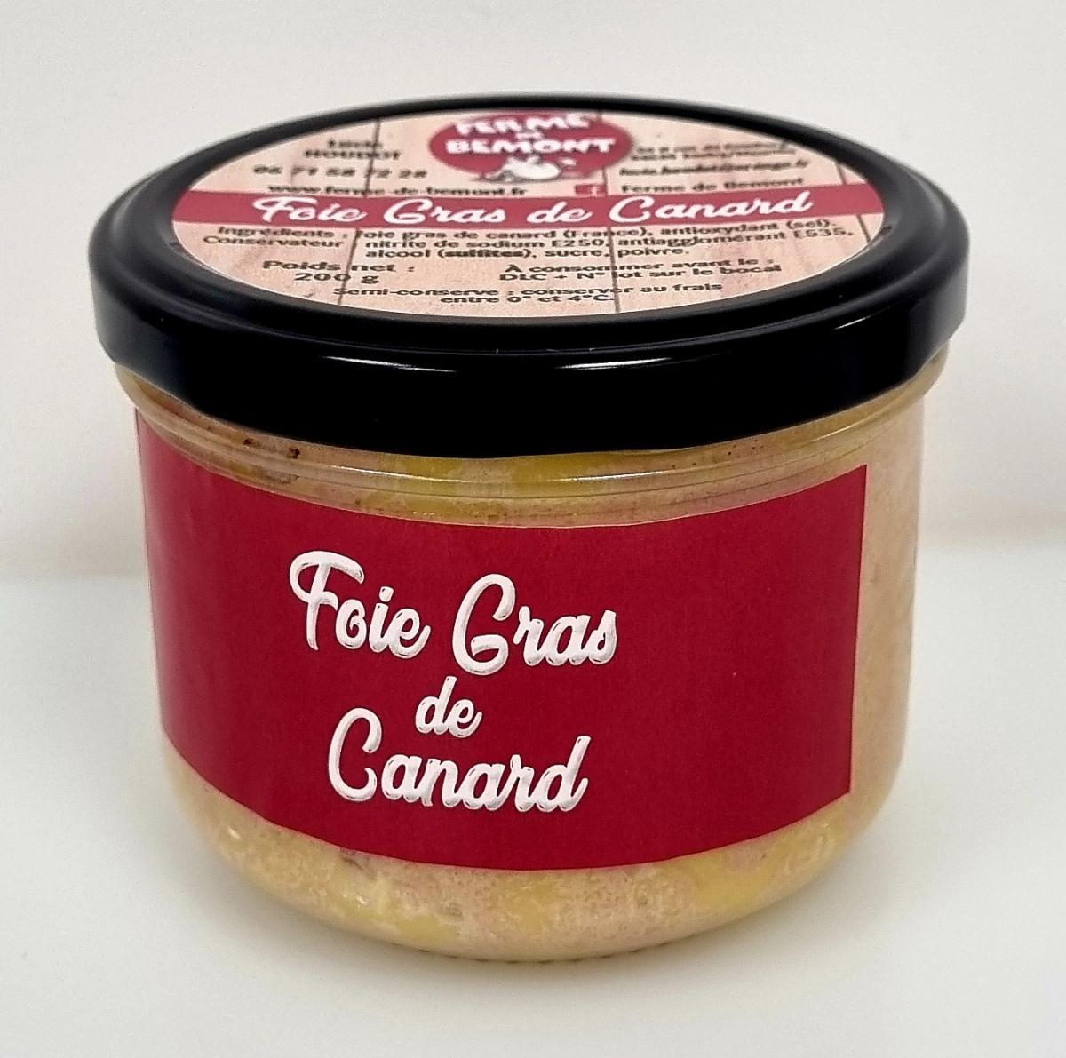 ingrédients : foie gras de canard, sel nitrité, poivre, alcool. Produit issu de notre ferme. Abat de canard La semi-conserve se garde au réfrigérateur entre 0 et 4 °C.  Sortez le bocal 10 min avant de servir. A servir en entrée avec du pain grillé, une petite salade et une gelée . Ou alors en apéritif sur des toasts ou encore sur une assiette gourmande.