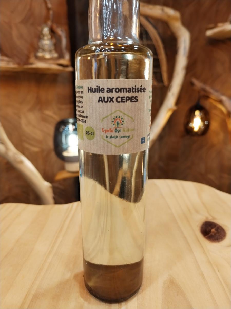 Huile de tournesol aromatisée aux cèpes, idéal pour assaisonner vos plats.