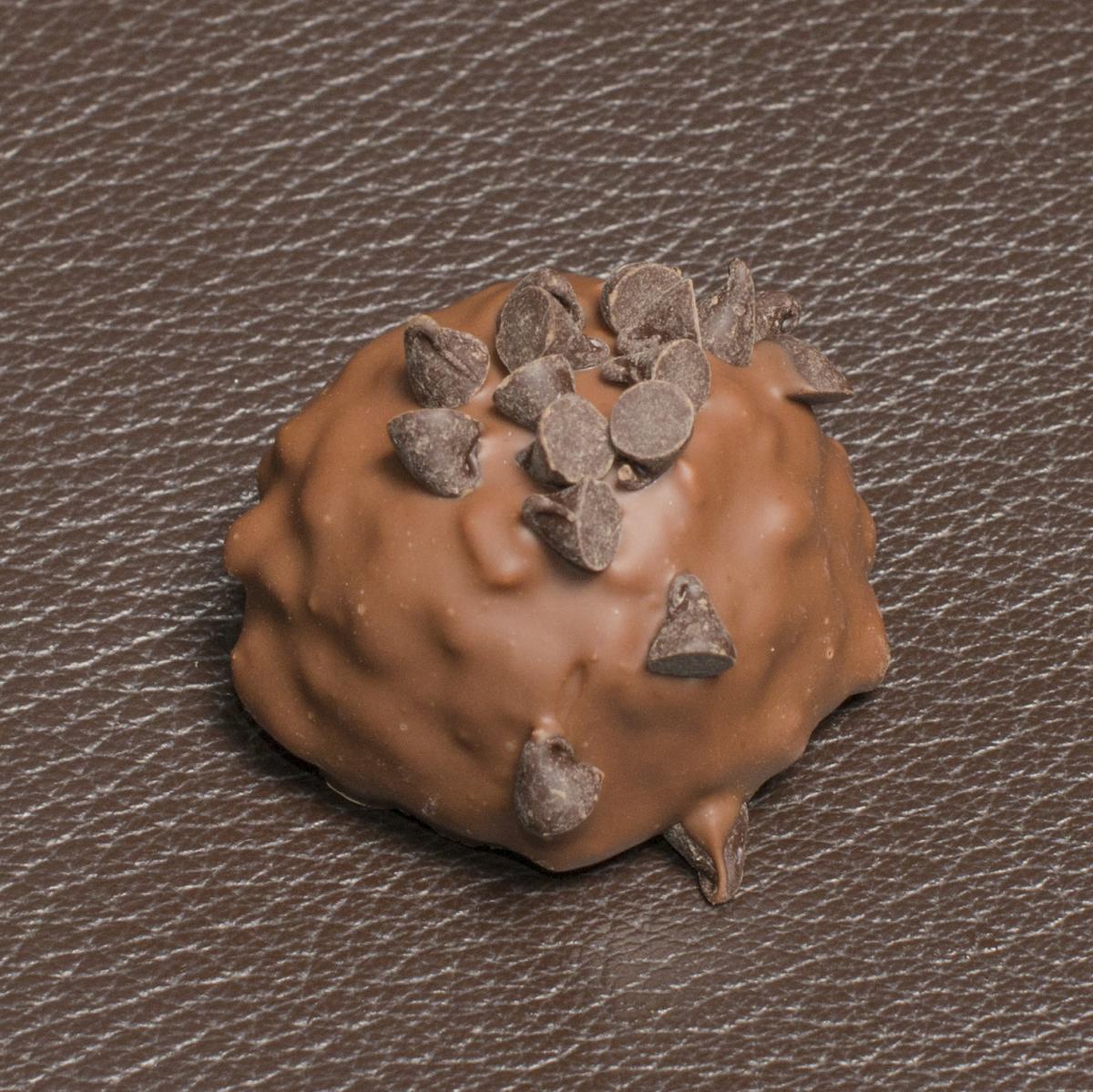 Composition: Beurre de cacao 38% minimum LAIT entier en poudre, poudre de LAIT écrémé, matière grasse de LAIT, sucre, beurre de cacao, émulsifiant : lécithine de tournesol, Praliné : AMANDES, NOISETTES, huile d’AMANDE raffinée, lécithine de SOJA, arôme vanille. Pépites de chocolat noir.