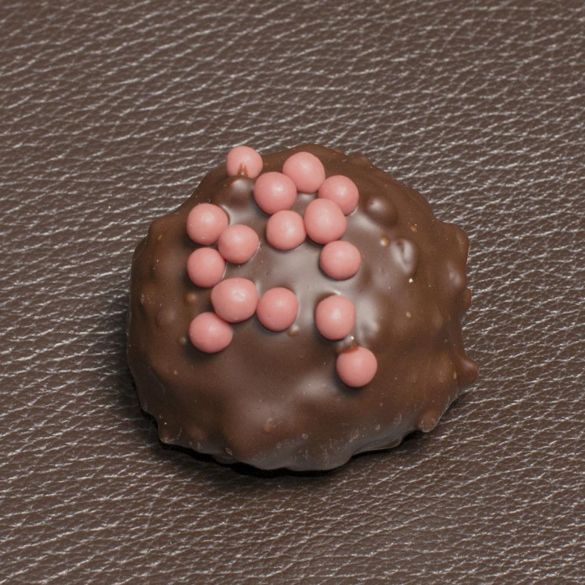 Composition: Beurre de cacao 64% minimum, pâte de cacao, sucre, émulsifiant : lécithine de tournesol, arôme naturel de vanille. Praliné : AMANDE, NOISETTES, huile d’AMANDE raffinée, lécithine de SOJA, arôme vanille,