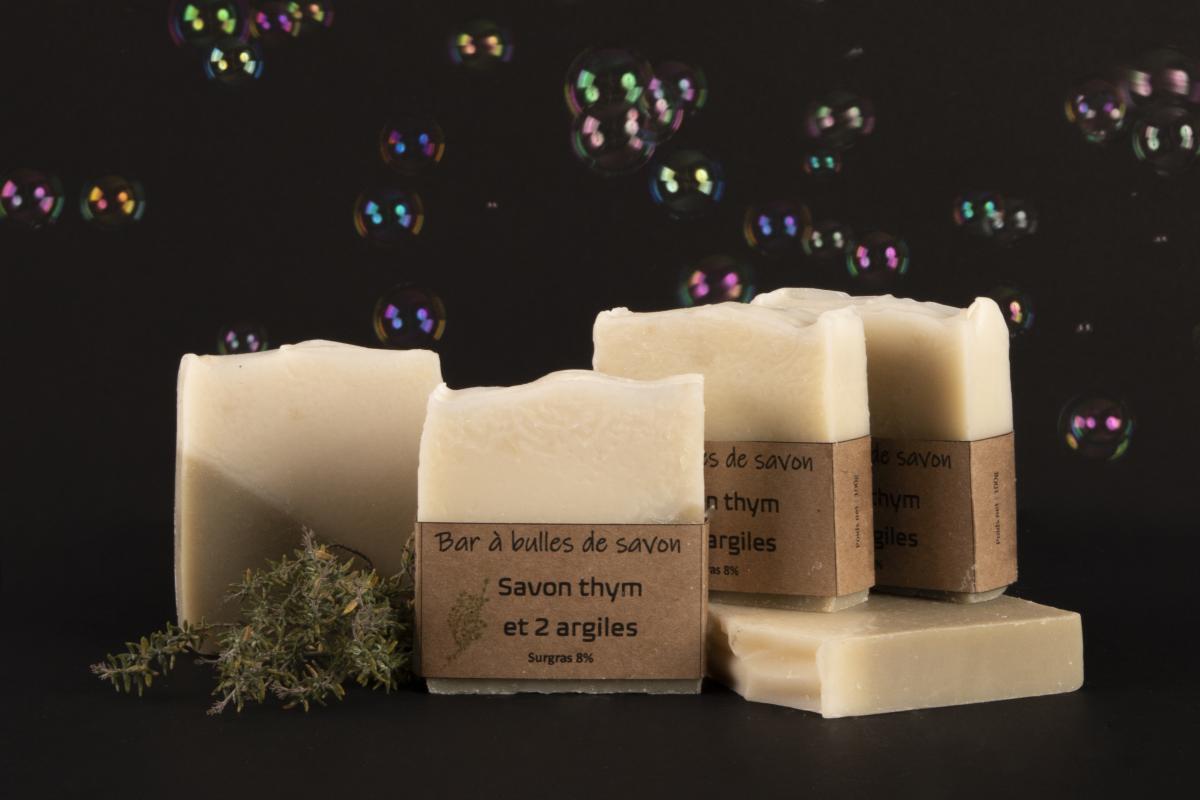 Savon au thym et 2 argiles, surgras 8%. Pour toutes les peaux, visage ou corps.