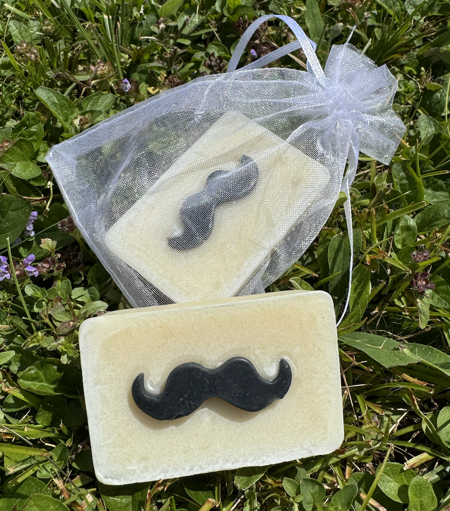 Savon moustache : 1 savon coco olive emballé dans un sac organza