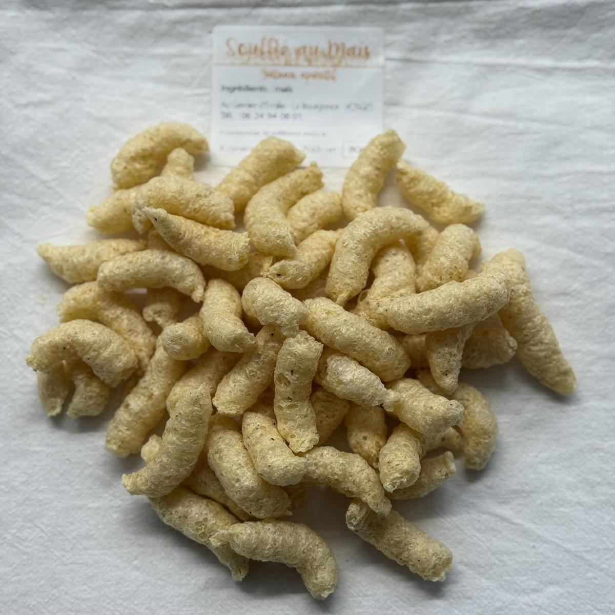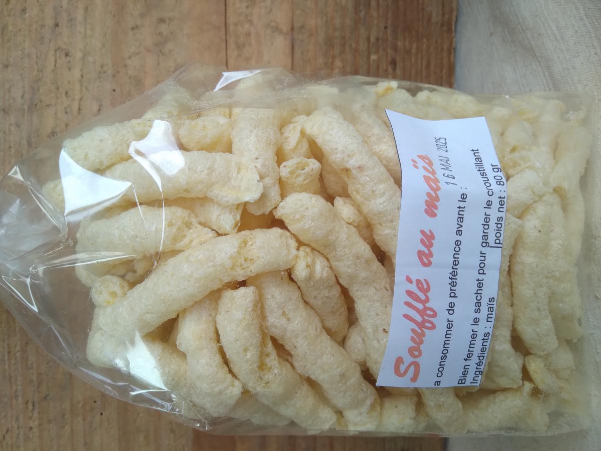 Souffle au mais extrudé sans aucun additif que du mais . Peut se manger nature ou avec des sauces pour l'apéritif.